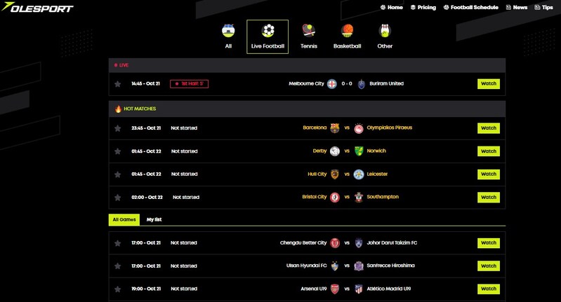 Điều khiến mình ấn tượng đầu tiên chính là giao diện của Olesport Live. Không cần mất thời gian tìm link hay bấm qua hàng loạt quảng cáo phiền toái, ở đây chỉ cần một cú chạm là có thể vào trận ngay. Giao diện được thiết kế tinh gọn, dễ hiểu, dù anh em mới vào lần đầu cũng có thể tìm được trận đấu mình muốn. Lịch thi đấu, highlight, kết quả hay tin tức đều nằm gọn trong một thanh menu gọn gàng, cực kỳ tiện lợi, thân thiện và “chill”.
